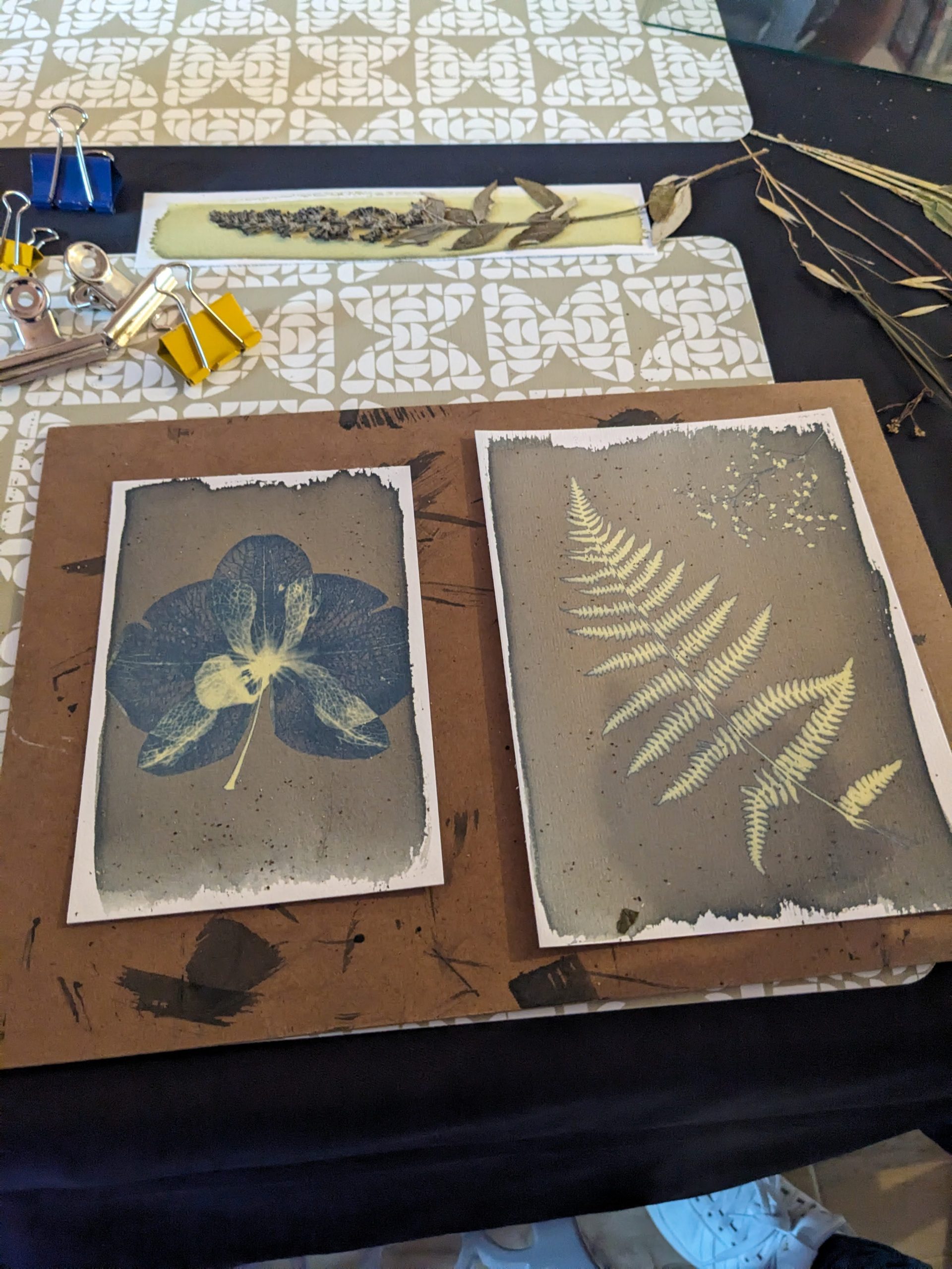 Tu développeras tes cyanotypes selon vos envies à partir d’éléments que je mettrai à ta disposition. Pendant 2h, tu laisseras ta créativité opérer dans une ambiance chaleureuse et détendue au sein de l’atelier. Tu repartiras avec tes 5 réalisations d’empreintes végétales solaires.